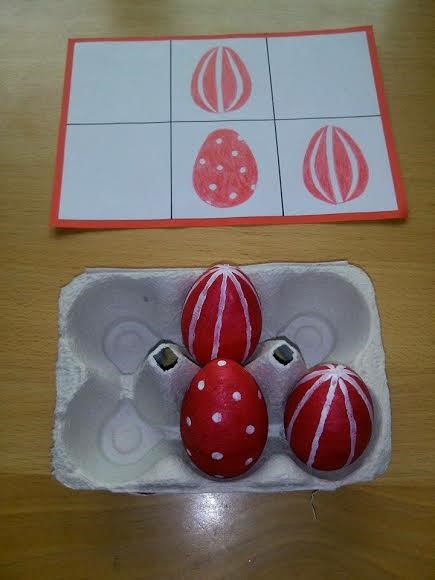 tojástartóba megadott minta szerint. A játék a gyerekek fejlettségének megfelelően bővíthető. Fejleszti a figyelmet, a megfigyelőképességet, a